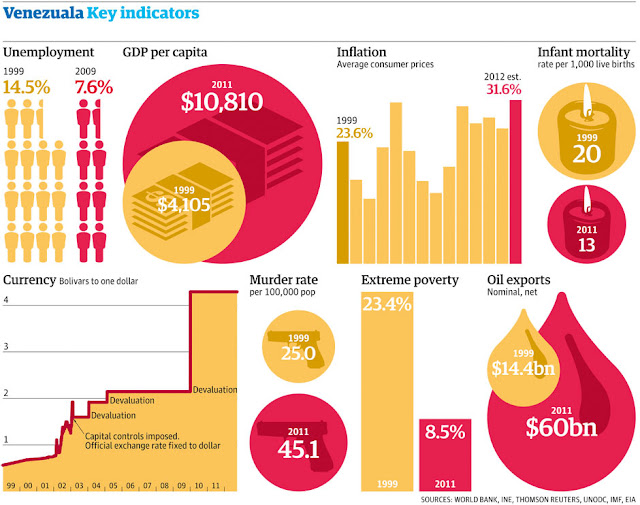 Durante toda a era Chávez, o crescimento do PIB da Venezuela foi menor do que o da América Latina e muito menor do que dos produtores de petróleo. O PIB per capita cresceu 27%, contra uma alta de quase 70% para o continente. Como proporção do PIB mundial, a economia do país ficou estagnada. A dívida pública bruta aumentou (assim como as reservas internacionais), a inflação caiu (mas ainda ficou alta demais para o padrão do resto do mundo) e as exportações de petróleo aumentaram cinco vezes (aumento médio dos outros produtores: nove vezes). No período, o preço do barril de petróleo aumentou 7,5 vezes.